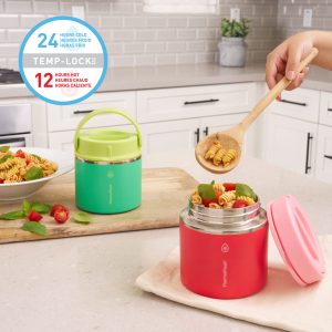 The ThermoFlask Food Jar keeps food hot or cold all day long with Temp-Lock™ technology. Perfect for everything from packing a warm lunch to keeping fruit cool and fresh during outdoor activities. it’s an essential upgrade from conventional food storage. The lid of the jar screws on to form a leak-proof seal so it’s lunch box safe. and boasts an easy grip handle. making it convenient to take anywhere.