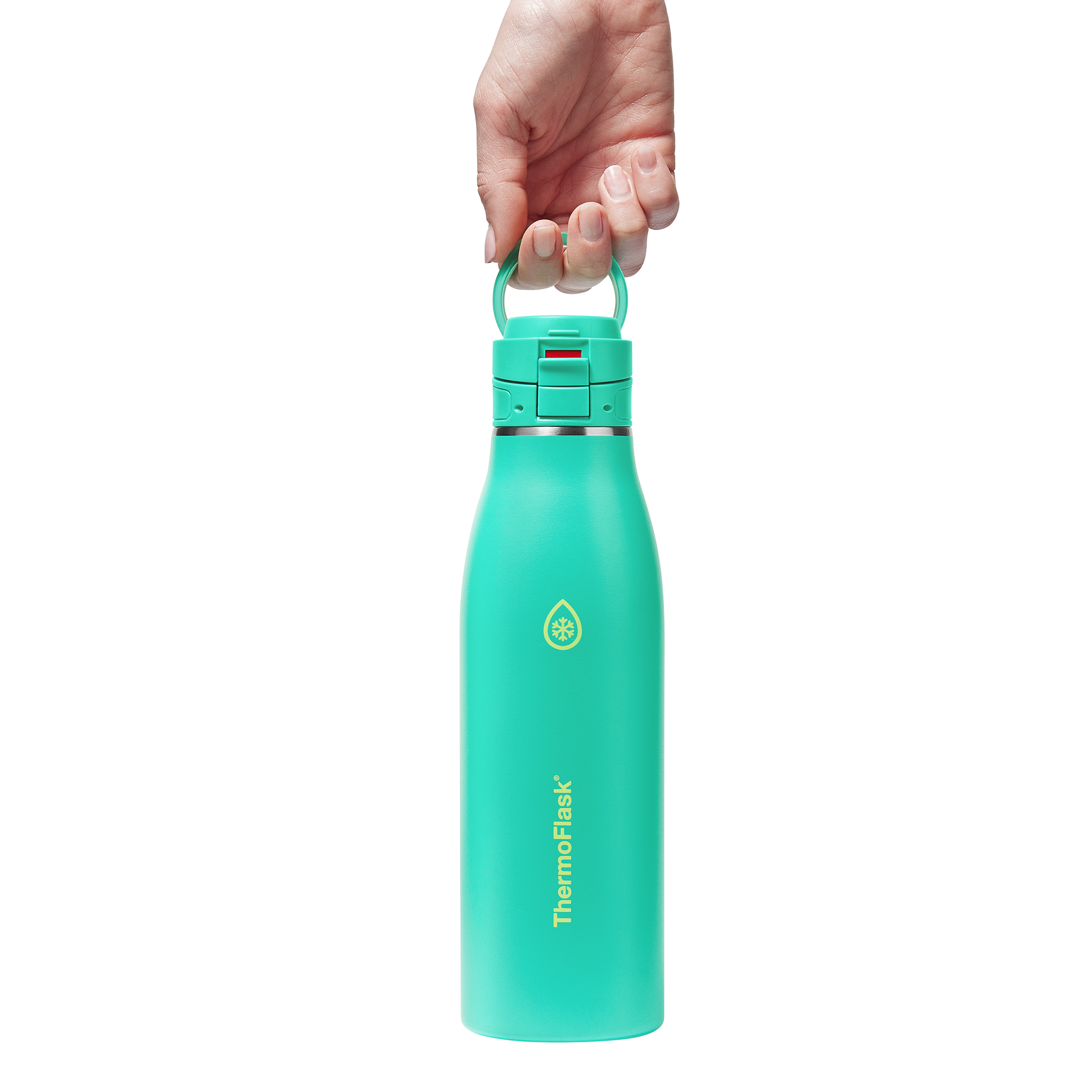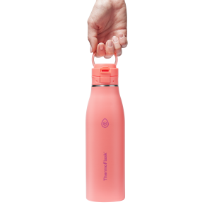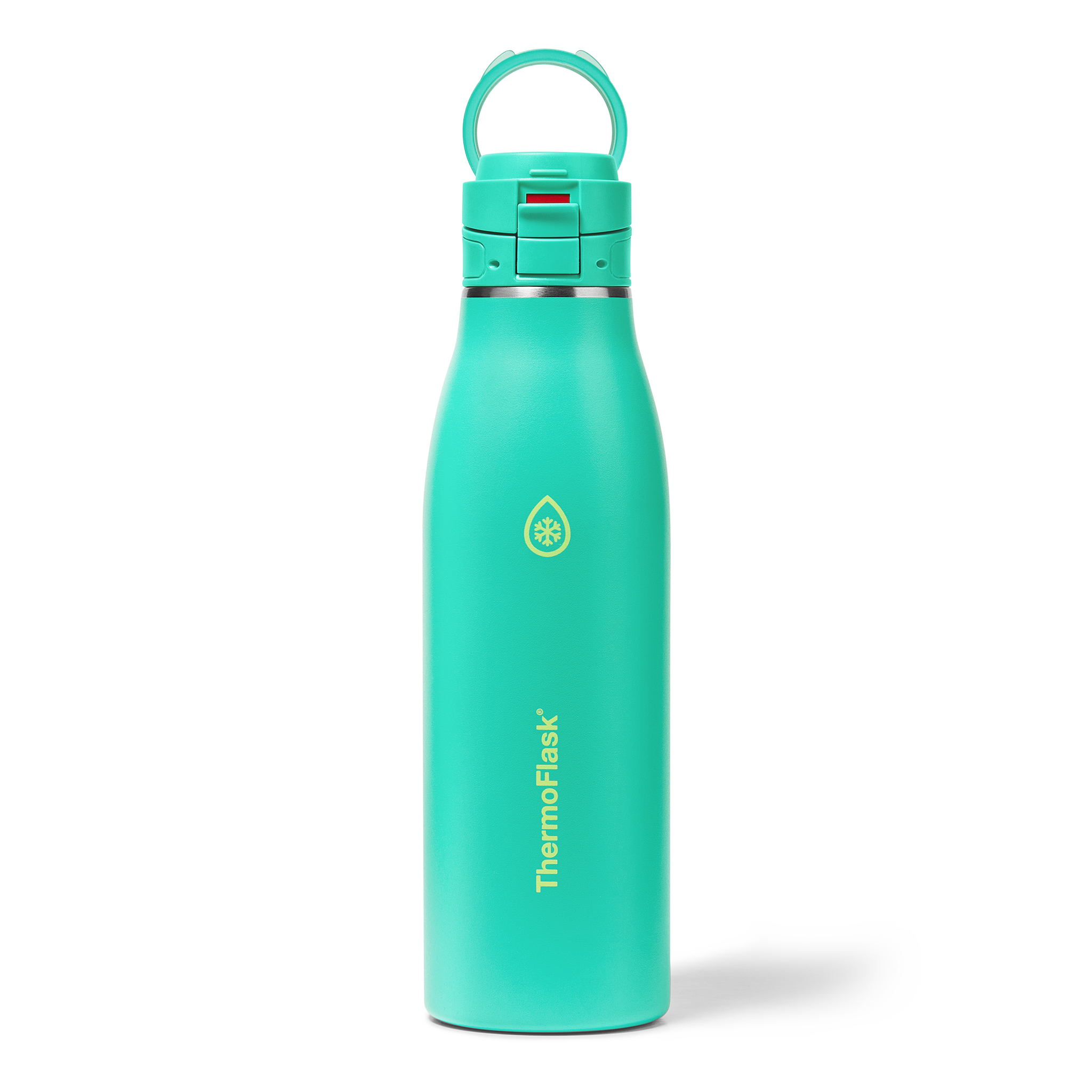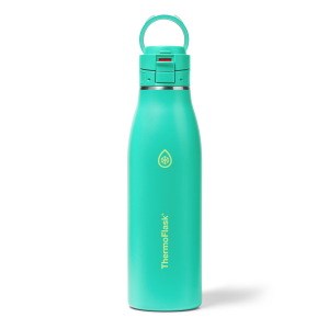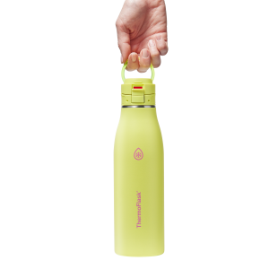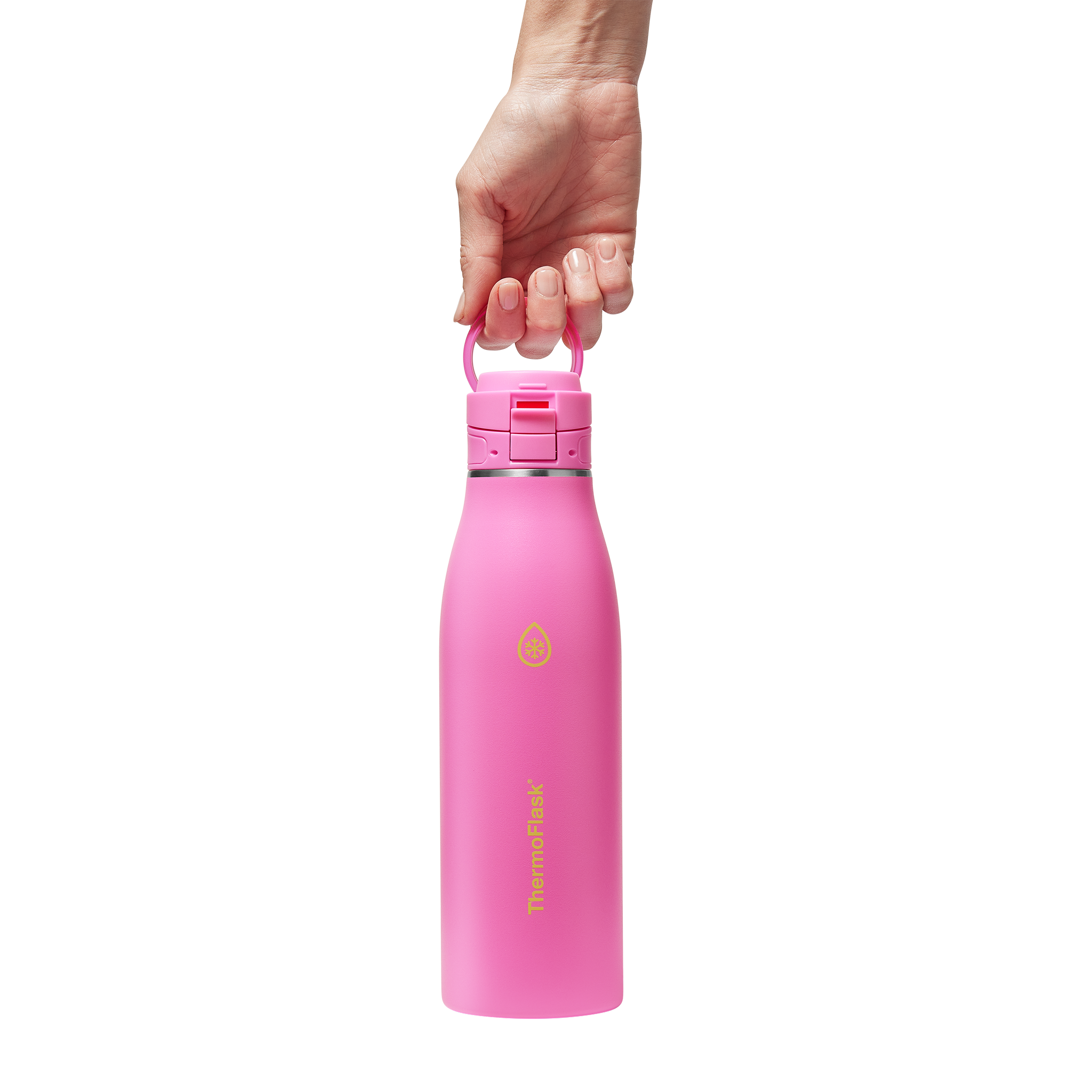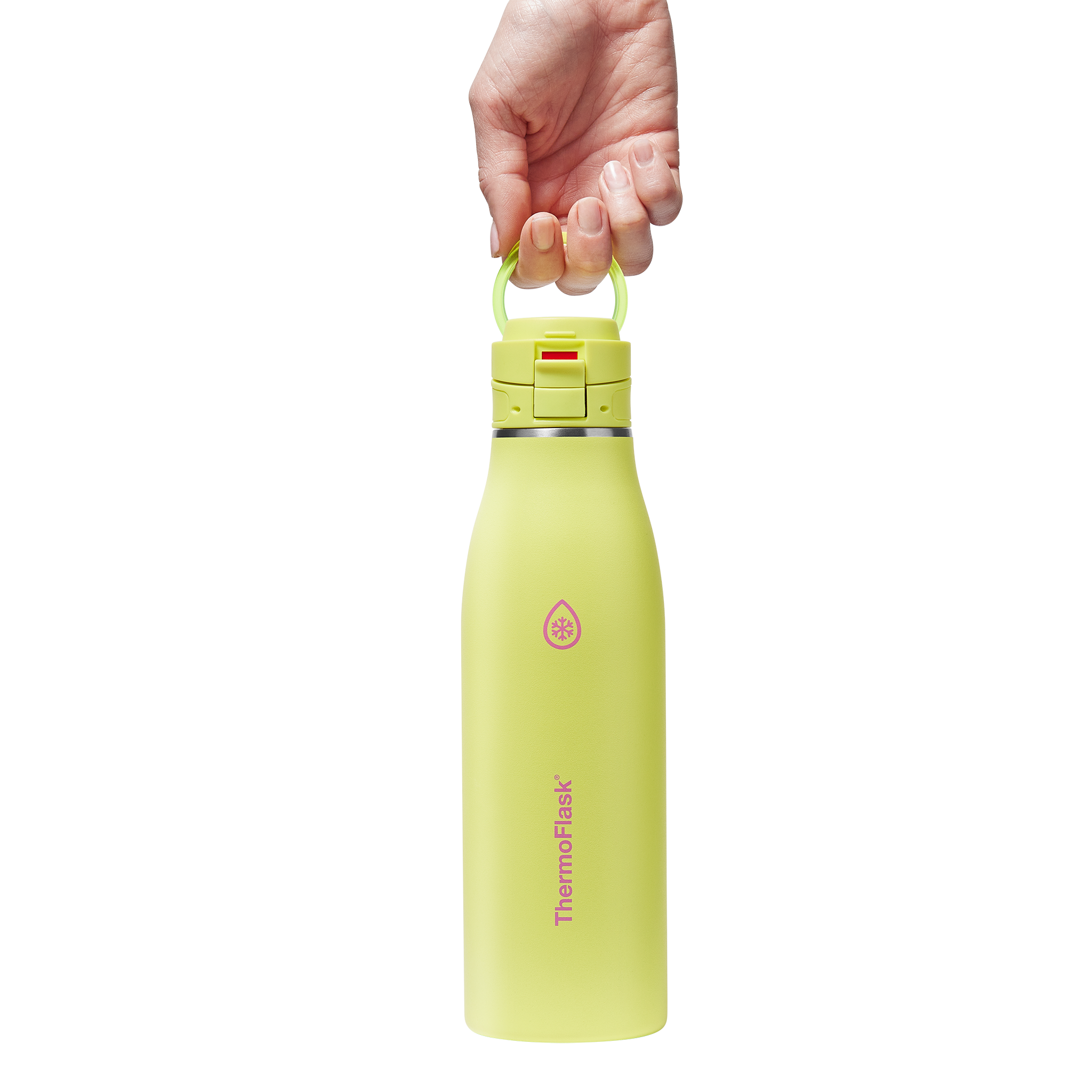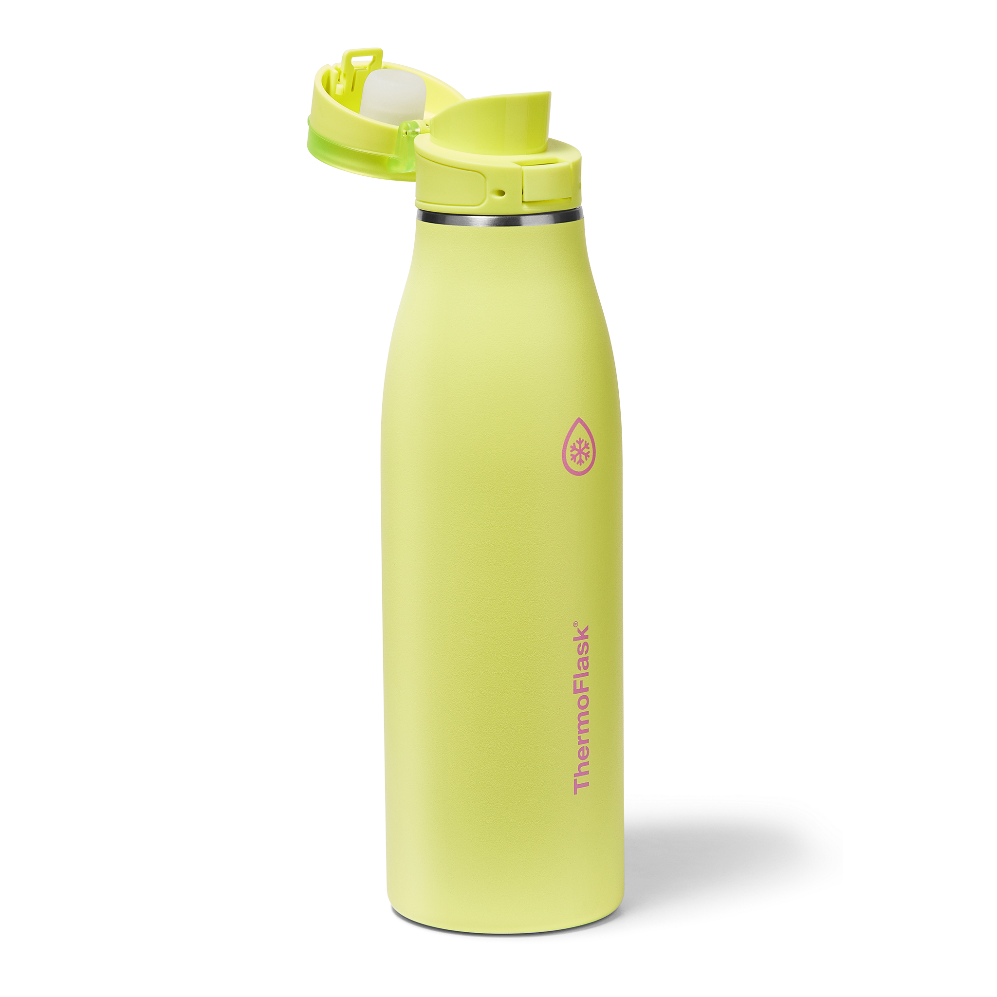 25oz Neon Traveler Bottle with bold powder coat finish. 100% leakproof comfort sip spout. cupholder-friendly design. and keeps drinks hot or cold for hours.
