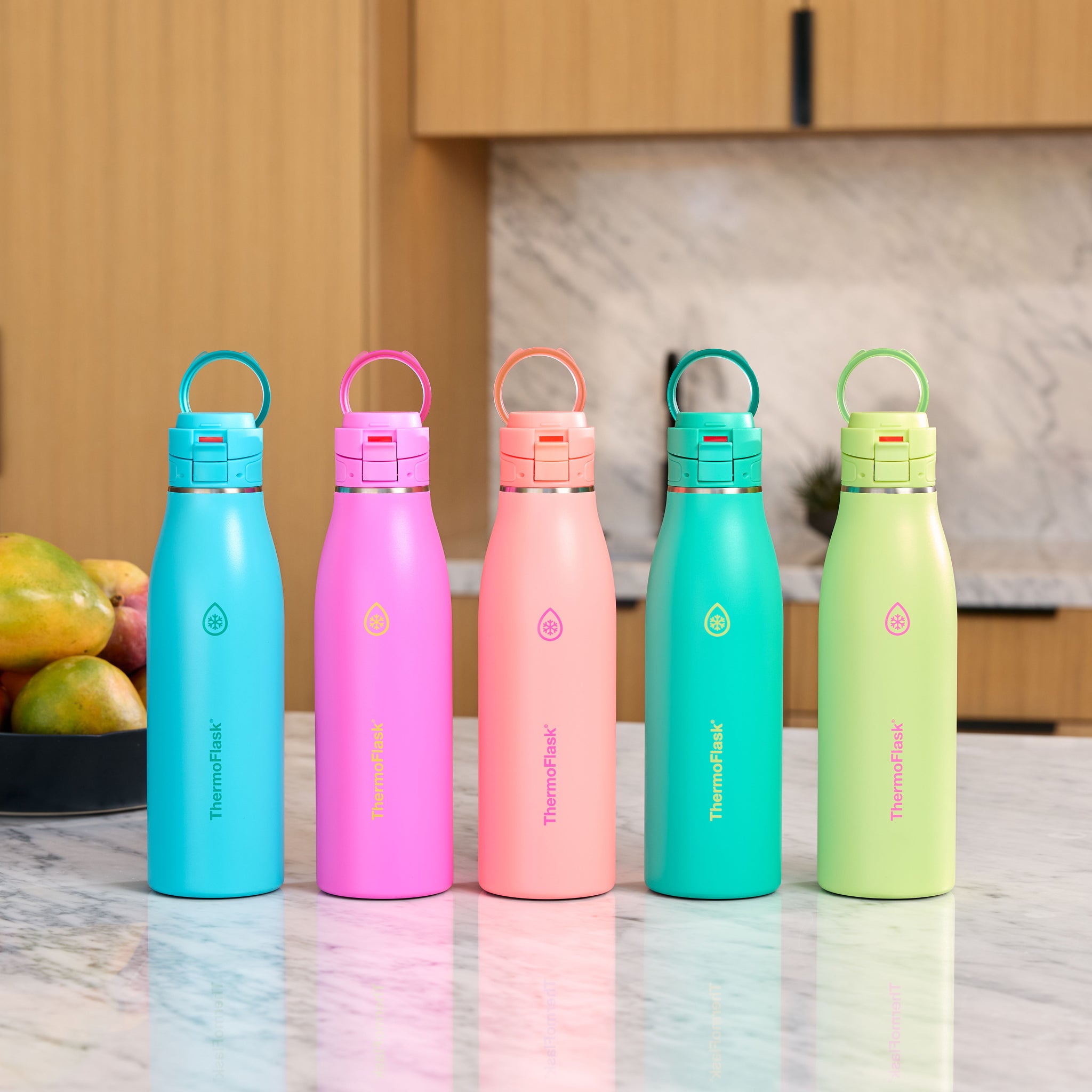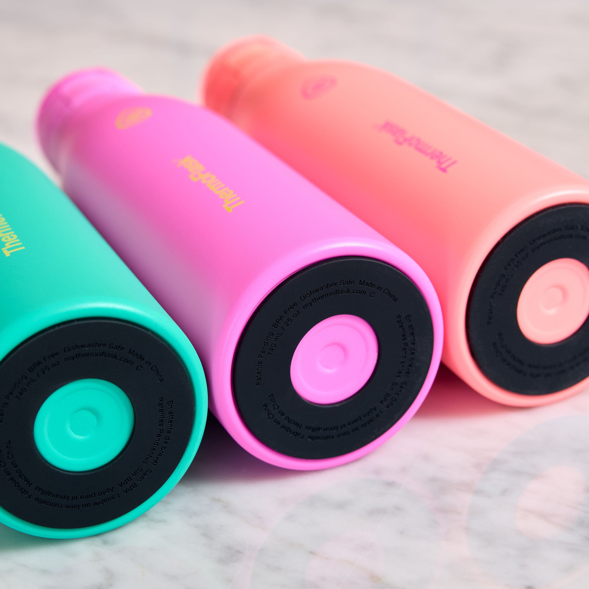 25oz Neon Traveler Bottle with bold powder coat finish. 100% leakproof comfort sip spout. cupholder-friendly design. and keeps drinks hot or cold for hours.