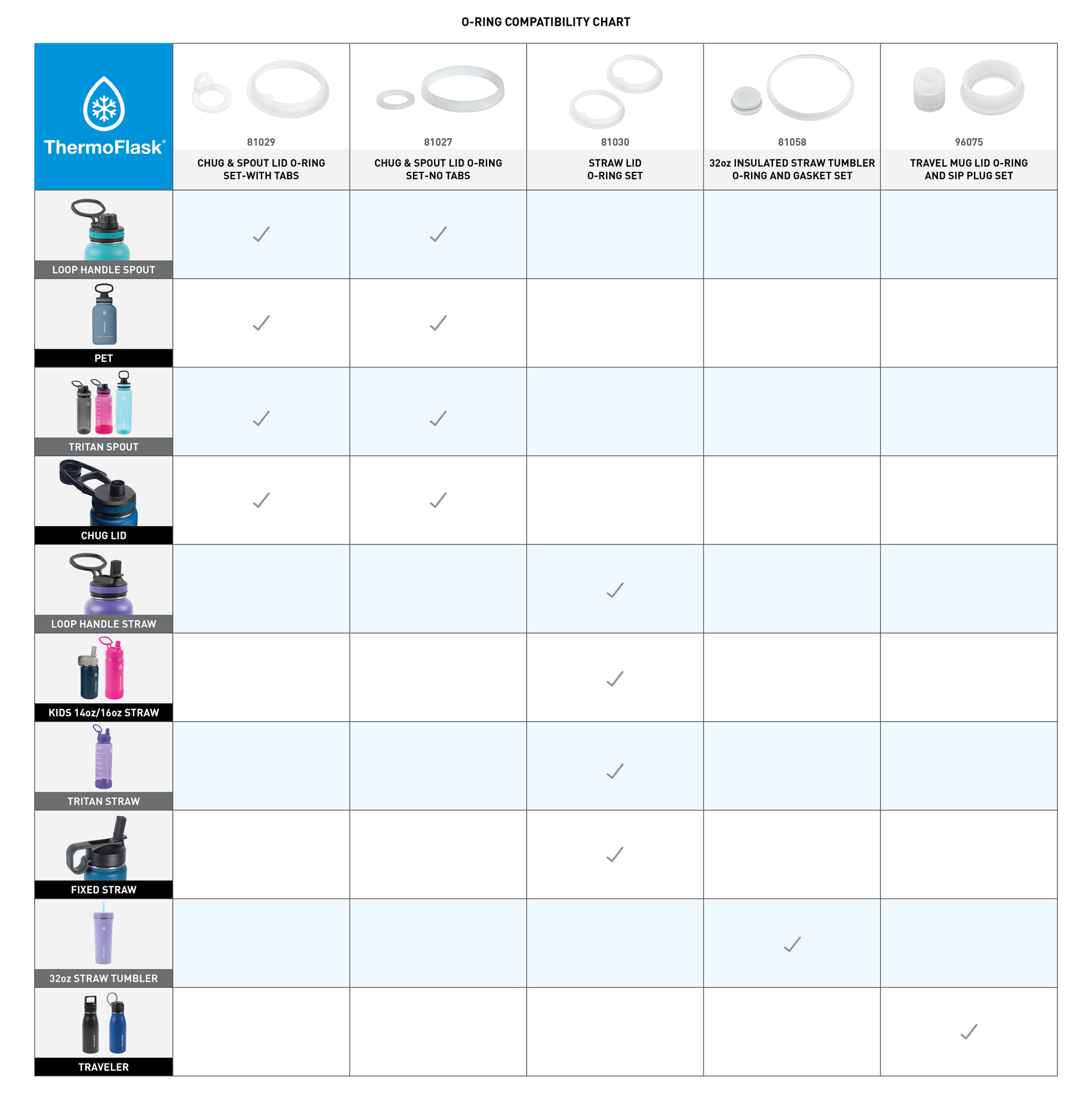 Designed for the ThermoFlask® Travel Mug. One O-Ring and one Sip Plug are included in the pack. The O-Ring fits on the bottom of the lid while the Sip Plug fits inside the fliplock lid. Both items are BPA free.